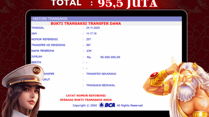 NAGA303 mengucapkan selamat kepada user id : VAL*** yang telah berhasil mendapatkan jackpot pada permainan LIVE CASINO DI ROULETTE 2. Kemenangan sebesar Rp 95.500.000,-. telah dibayarkan LUNAS oleh pihak naga303 kepada pemilik user id setelah yang bersangkutan mengisi formulir withdraw. Proses pencairan dana berlangsung sangat cepat hanya dalam waktu 6-11 menit sudah berada dalam rekening pemilik user id. Bukti transfer yang dapat anda lihat adalah bukti SAH / VALID yang langsung di dapatkan melalui bukti transaksi dari Bank yang digunakan untuk pengiriman dana pada rekening pemilik user id. Terima kasih kami sampaikan kepada para pengguna setia naga303 yang telah menggunakan situs kami, sebagai Bandar Terpercaya yang pastinya membayar semua kemenangan member hingga lunas. Apakah Naga303 PENIPU ? Reputasi “NAGA303 TERPERCAYA” sudah sangat melekat. puluhan hingga ratusan ribu pengguna setia NAGA303 tetap menggunakan situs terbesar dan terbaik di Indonesia ini. Hapus rasa was-was dan khawatir anda, kemenangan anda berapapun PASTI dibayarkan hingga lunas.