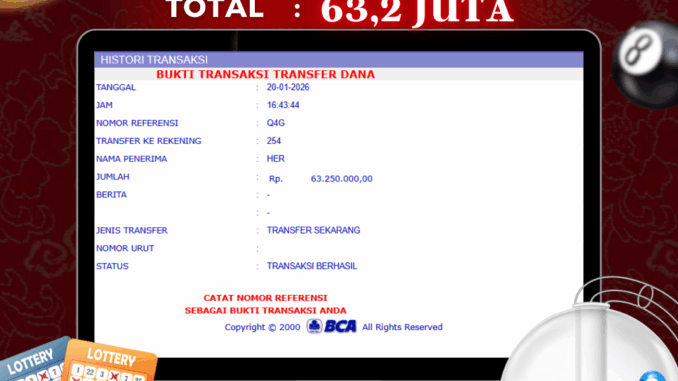 NAGA303 mengucapkan selamat kepada user id : HER*** yang telah berhasil mendapatkan jackpot pada permainan TOGEL DI SYDNEY LOTTO. Kemenangan sebesar Rp 63.250.000,-. telah dibayarkan LUNAS oleh pihak naga303 kepada pemilik user id setelah yang bersangkutan mengisi formulir withdraw. Proses pencairan dana berlangsung sangat cepat hanya dalam waktu 6-11 menit sudah berada dalam rekening pemilik user id. Bukti transfer yang dapat anda lihat adalah bukti SAH / VALID yang langsung di dapatkan melalui bukti transaksi dari Bank yang digunakan untuk pengiriman dana pada rekening pemilik user id. Terima kasih kami sampaikan kepada para pengguna setia naga303 yang telah menggunakan situs kami, sebagai Bandar Terpercaya yang pastinya membayar semua kemenangan member hingga lunas. Apakah Naga303 PENIPU ? Reputasi “NAGA303 TERPERCAYA” sudah sangat melekat. puluhan hingga ratusan ribu pengguna setia NAGA303 tetap menggunakan situs terbesar dan terbaik di Indonesia ini. Hapus rasa was-was dan khawatir anda, kemenangan anda berapapun PASTI dibayarkan hingga lunas.