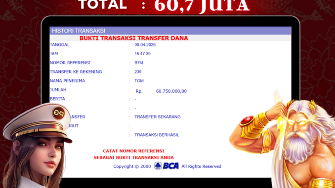 NAGA303 mengucapkan selamat kepada user id : LAM*** yang telah berhasil mendapatkan jackpot pada permainan SLOT DI AZTEC GEMS. Kemenangan sebesar Rp 60.750.000,-. telah dibayarkan LUNAS oleh pihak naga303 kepada pemilik user id setelah yang bersangkutan mengisi formulir withdraw. Proses pencairan dana berlangsung sangat cepat hanya dalam waktu 6-11 menit sudah berada dalam rekening pemilik user id. Bukti transfer yang dapat anda lihat adalah bukti SAH / VALID yang langsung di dapatkan melalui bukti transaksi dari Bank yang digunakan untuk pengiriman dana pada rekening pemilik user id. Terima kasih kami sampaikan kepada para pengguna setia naga303 yang telah menggunakan situs kami, sebagai Bandar Terpercaya yang pastinya membayar semua kemenangan member hingga lunas. Apakah Naga303 PENIPU ? Reputasi “NAGA303 TERPERCAYA” sudah sangat melekat. puluhan hingga ratusan ribu pengguna setia NAGA303 tetap menggunakan situs terbesar dan terbaik di Indonesia ini. Hapus rasa was-was dan khawatir anda, kemenangan anda berapapun PASTI dibayarkan hingga lunas.